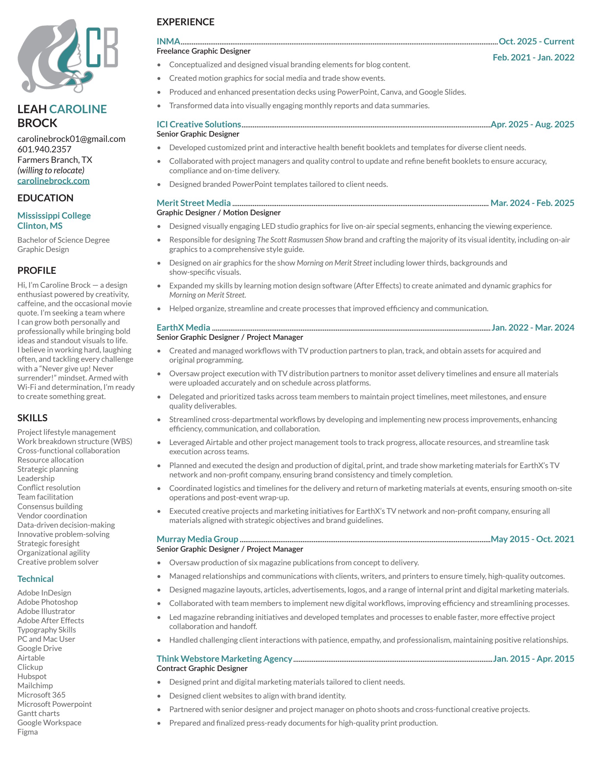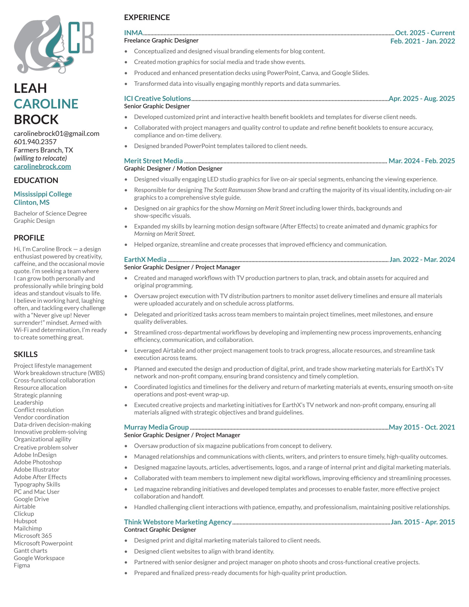 Hi, I’m Caroline Brock — a design enthusiast fueled by creativity, coffee, and the occasional movie quote. I’ve sharpened my skills managing and designing projects across industries—from magazine production to TV networks, tradeshows, events, and everything in between. Digital or print, if it needs design, I make it happen.